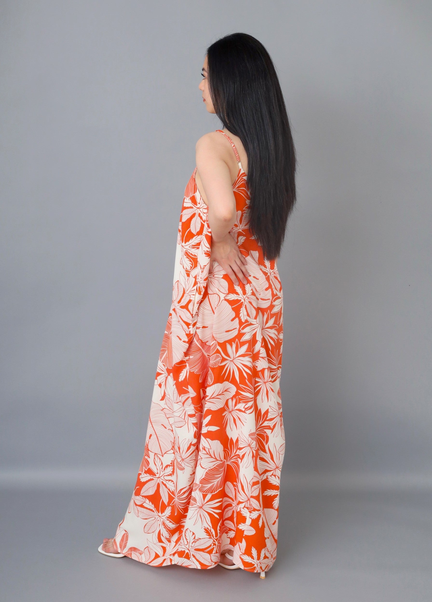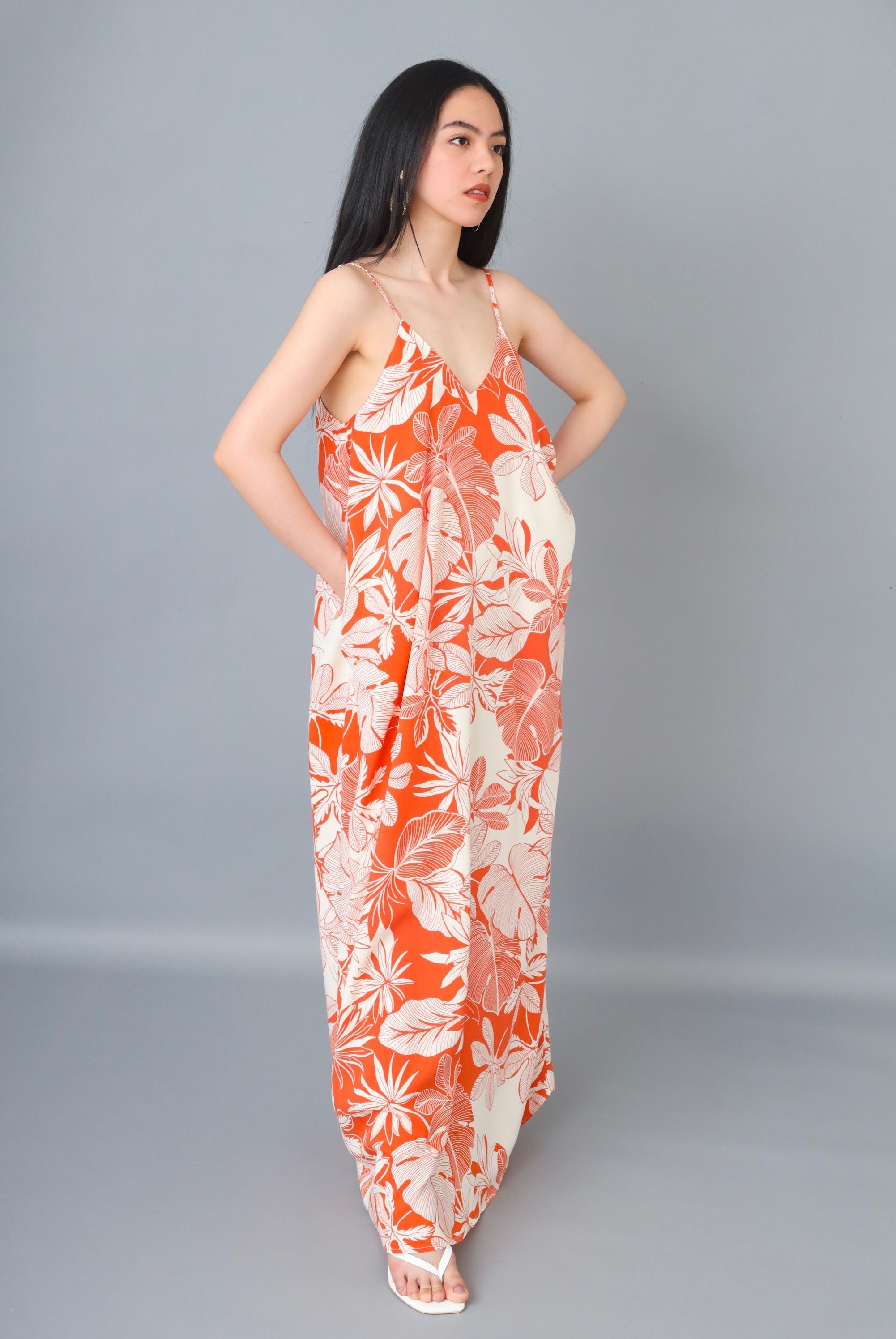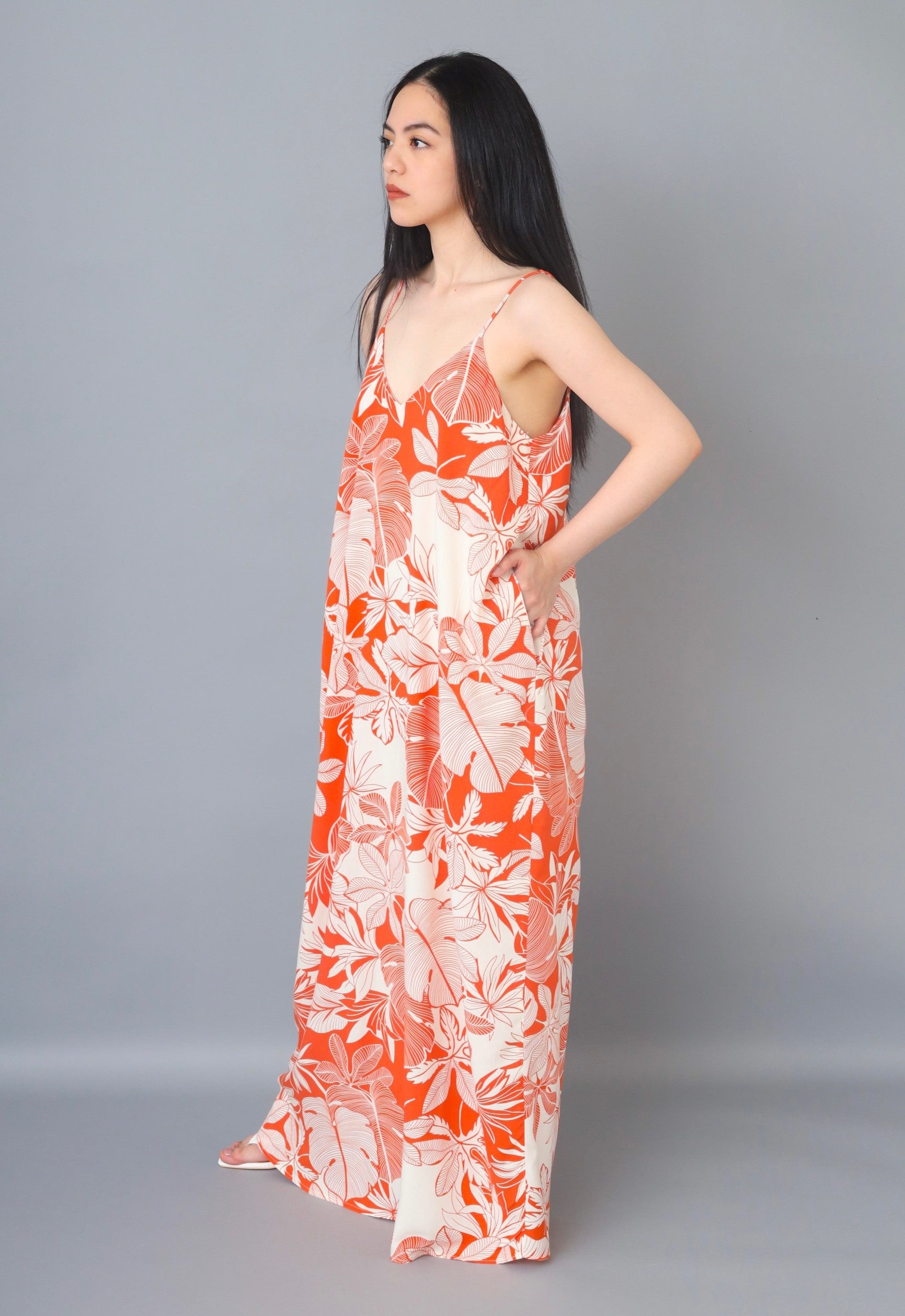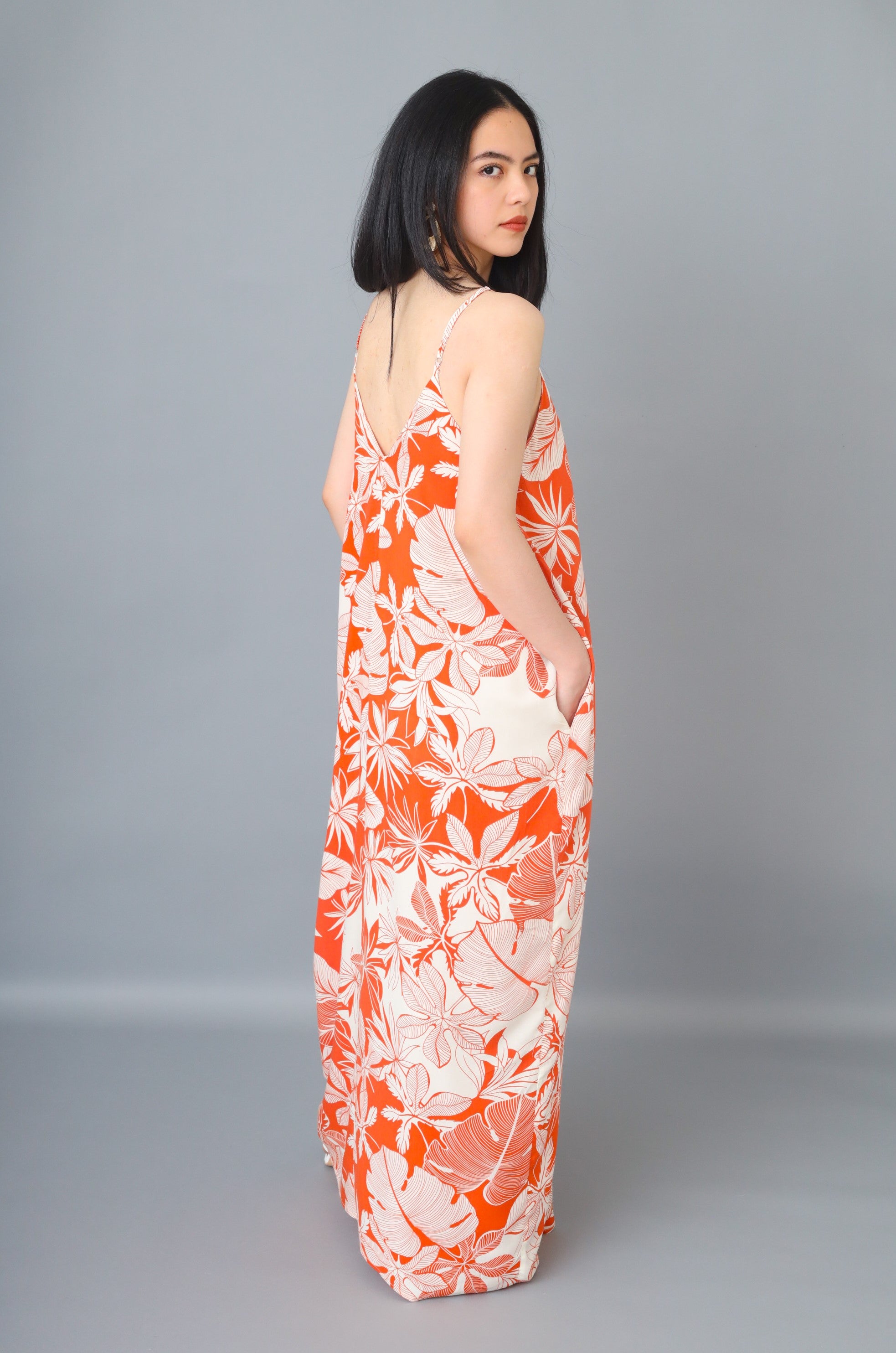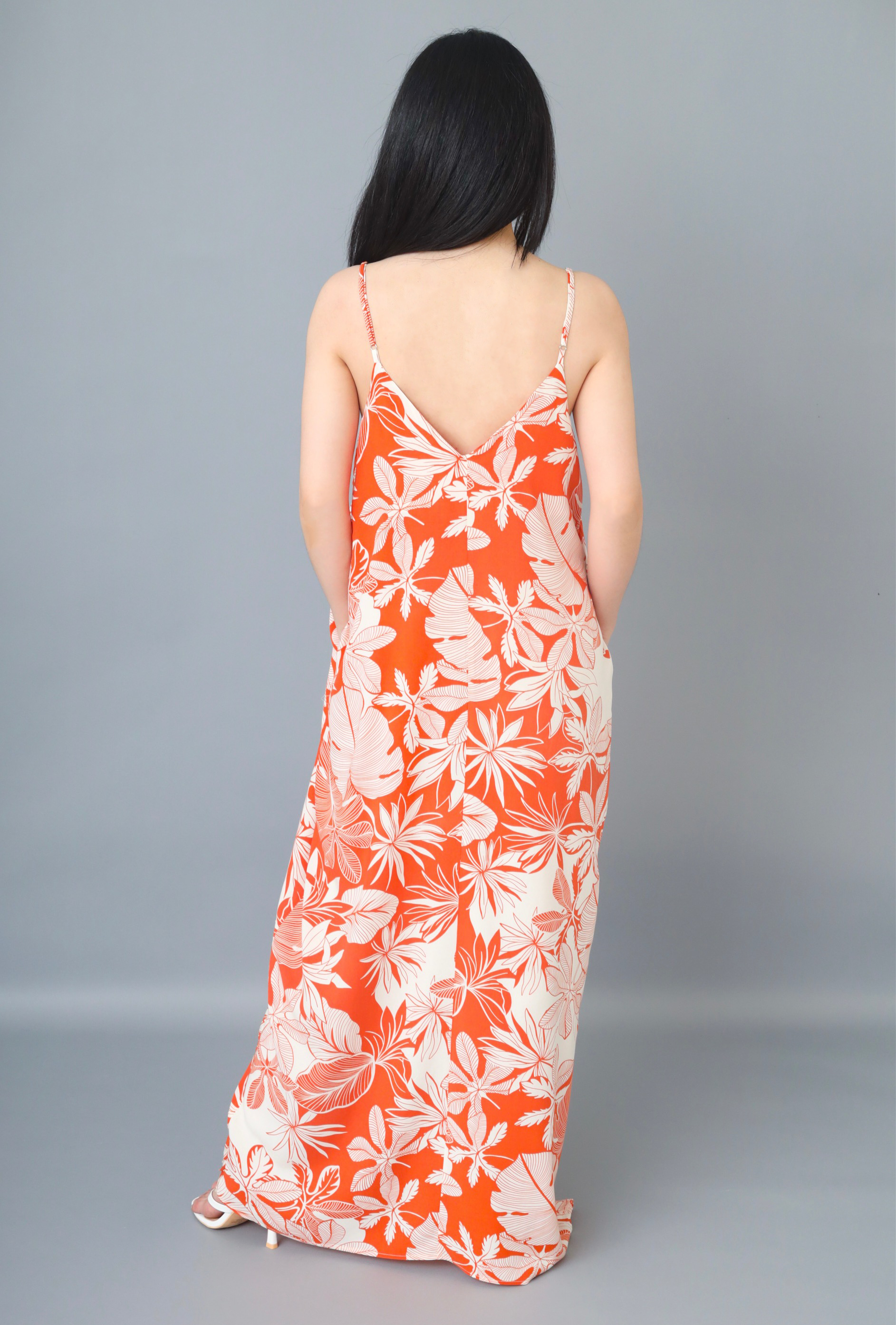 The perfect dress for those hot summer days. This charmingly simple Boho maxi dress is a lightweight woven fabric with vibrant orange and white floral print. A relaxed-fit bodice falls from adjustable spaghetti straps, a V neckline, and a back with hidden side pockets.