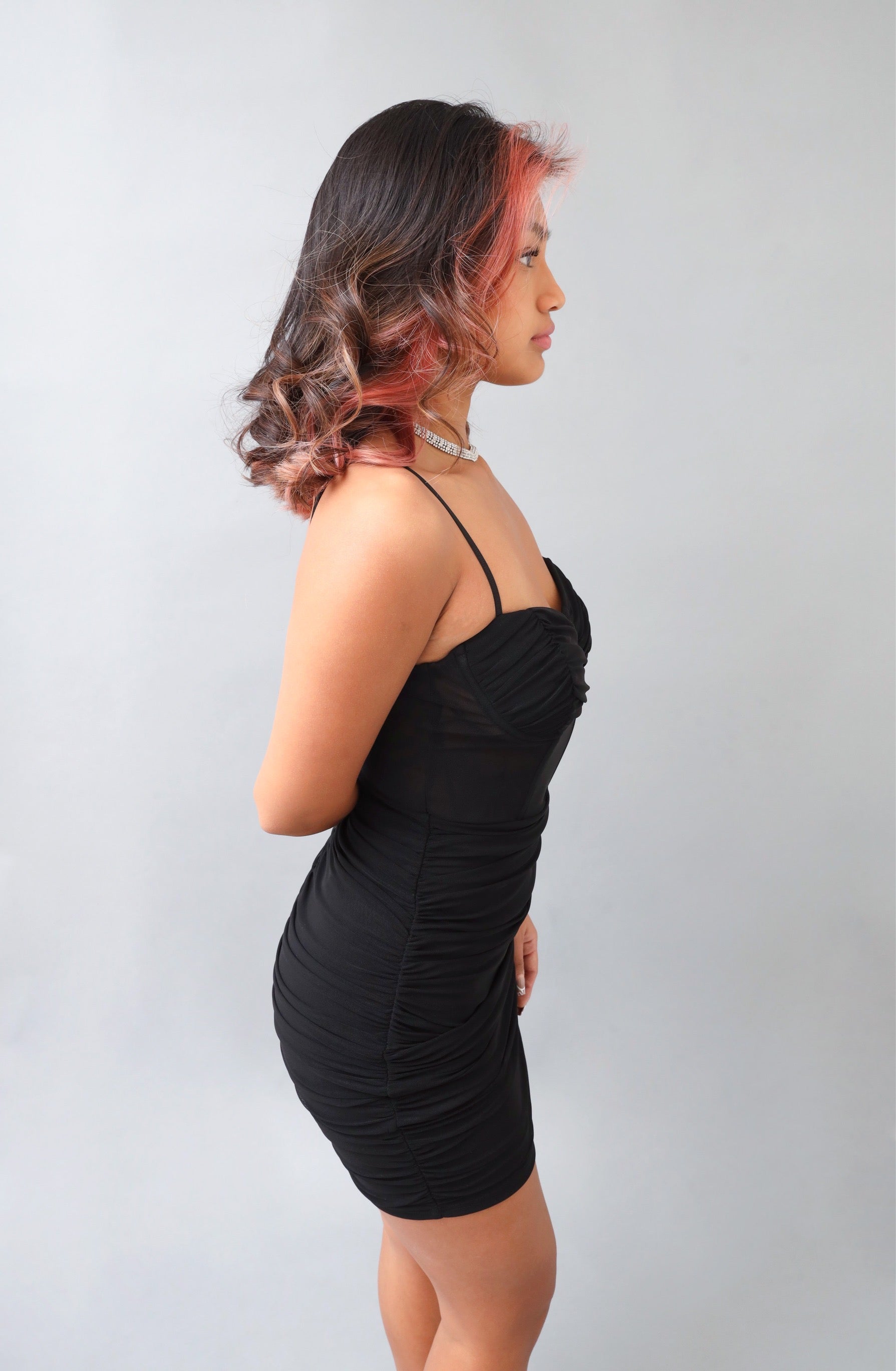 Transform your dance outfit with this stunning black corset-style mini dress! The corset-style top is designed to fit and flatter your figure, while the adjustable spaghetti straps ensure a comfortable and secure fit. The ruched mini skirt adds elegance, drawing attention to your beautiful silhouette as you move on the dance floor. You will want to take advantage of this must-have piece for a night of nonstop dancing. The dress also includes a hidden back zipper and clasp for convenience and security.