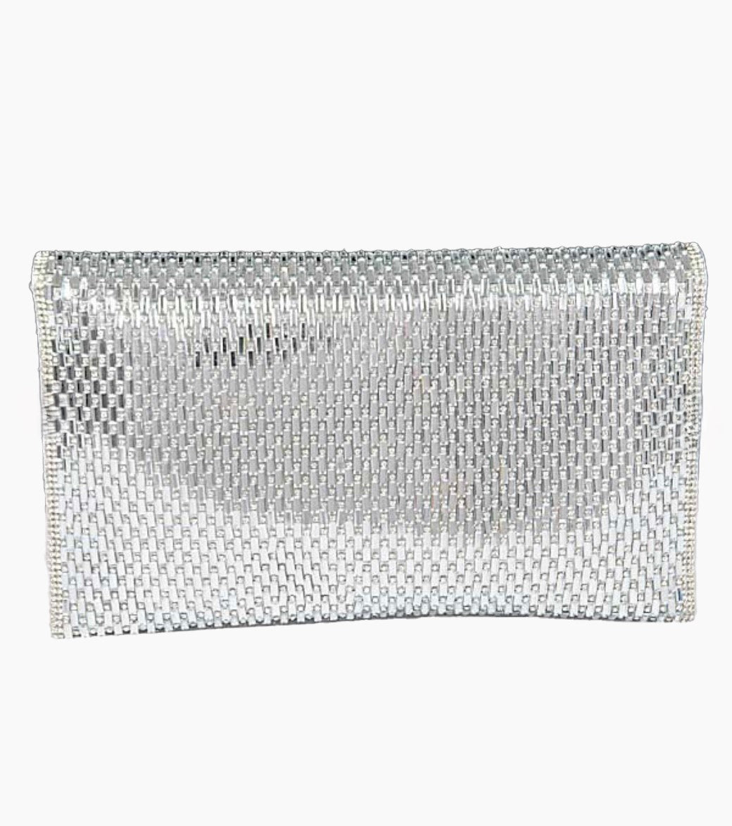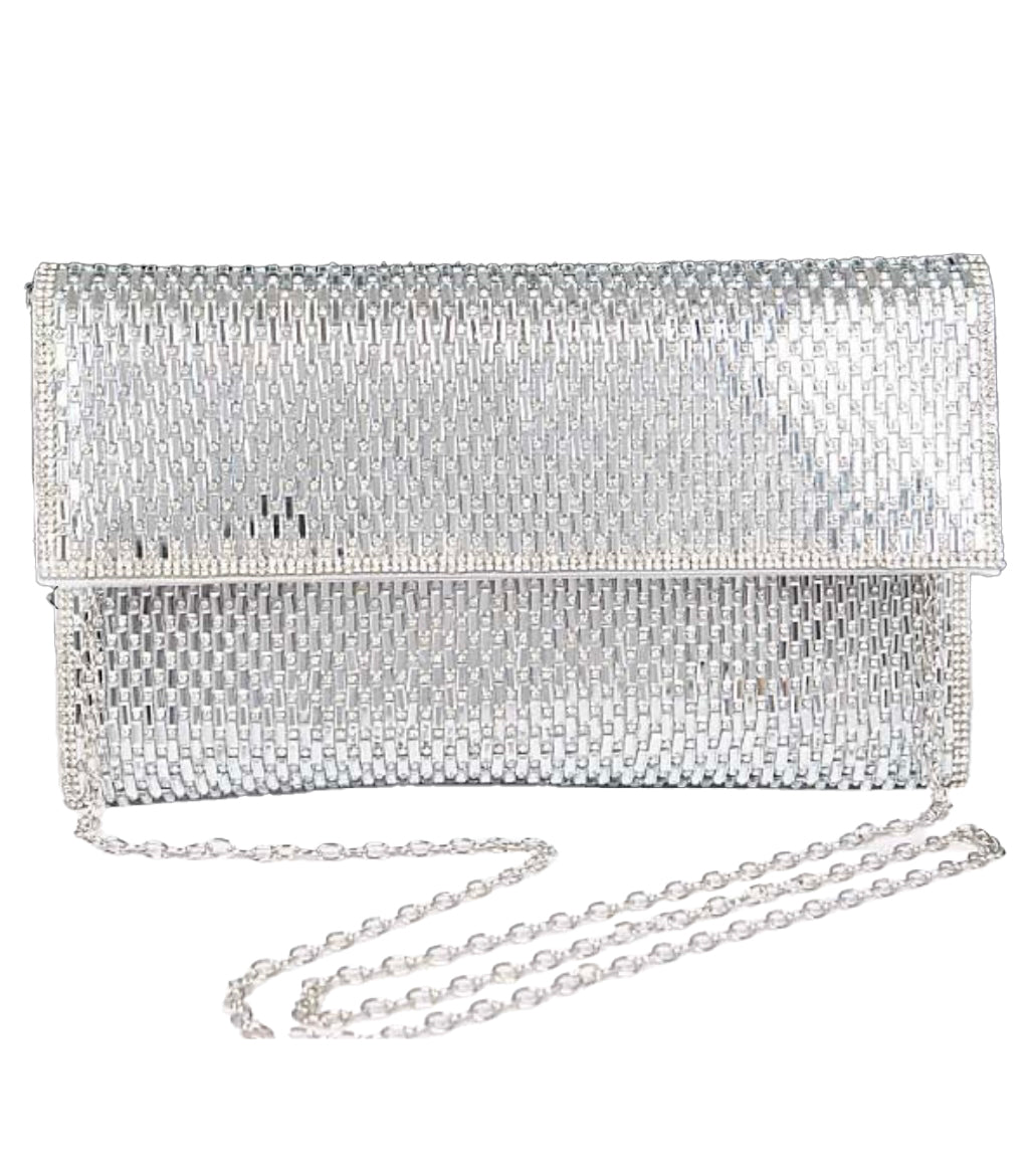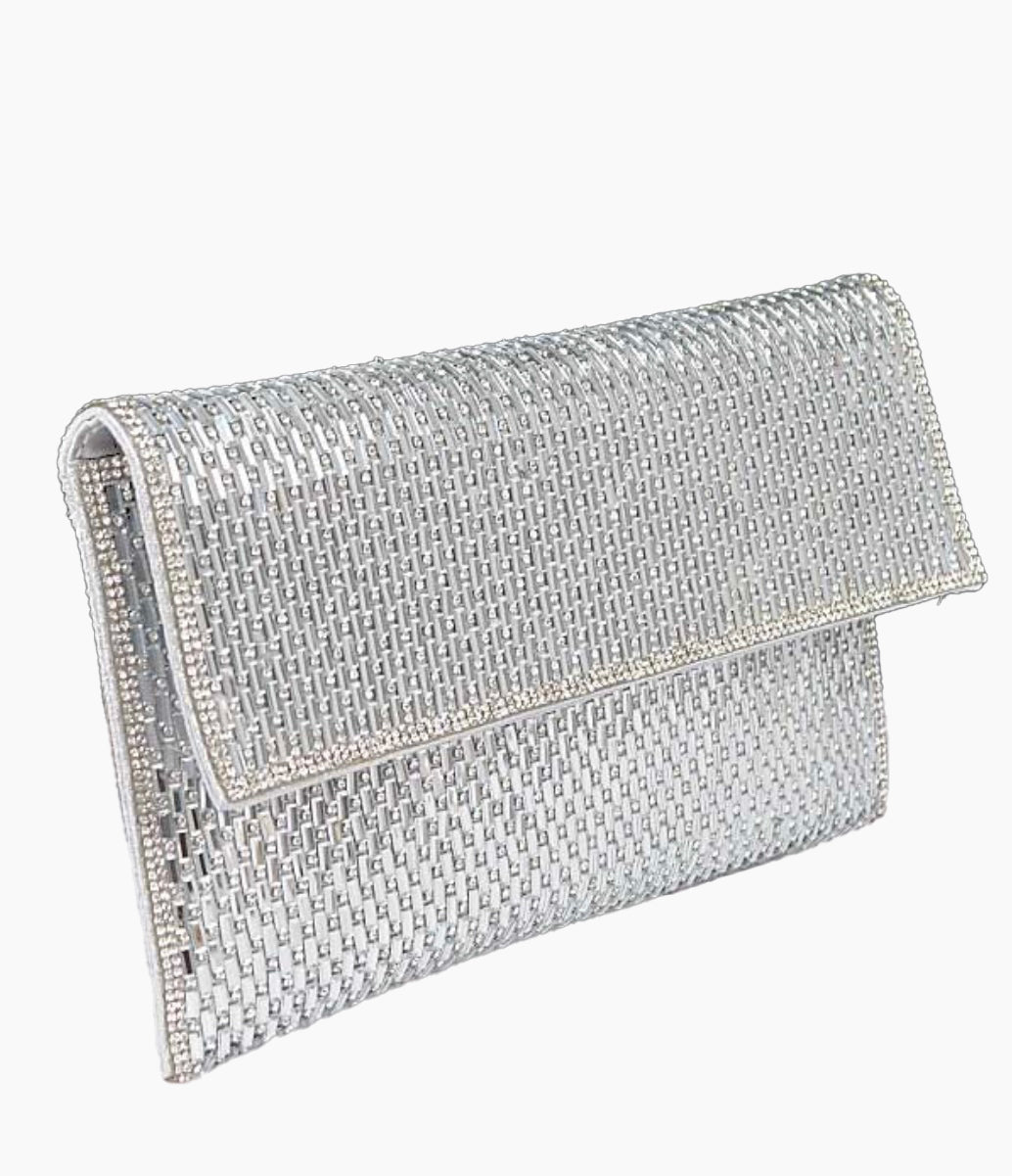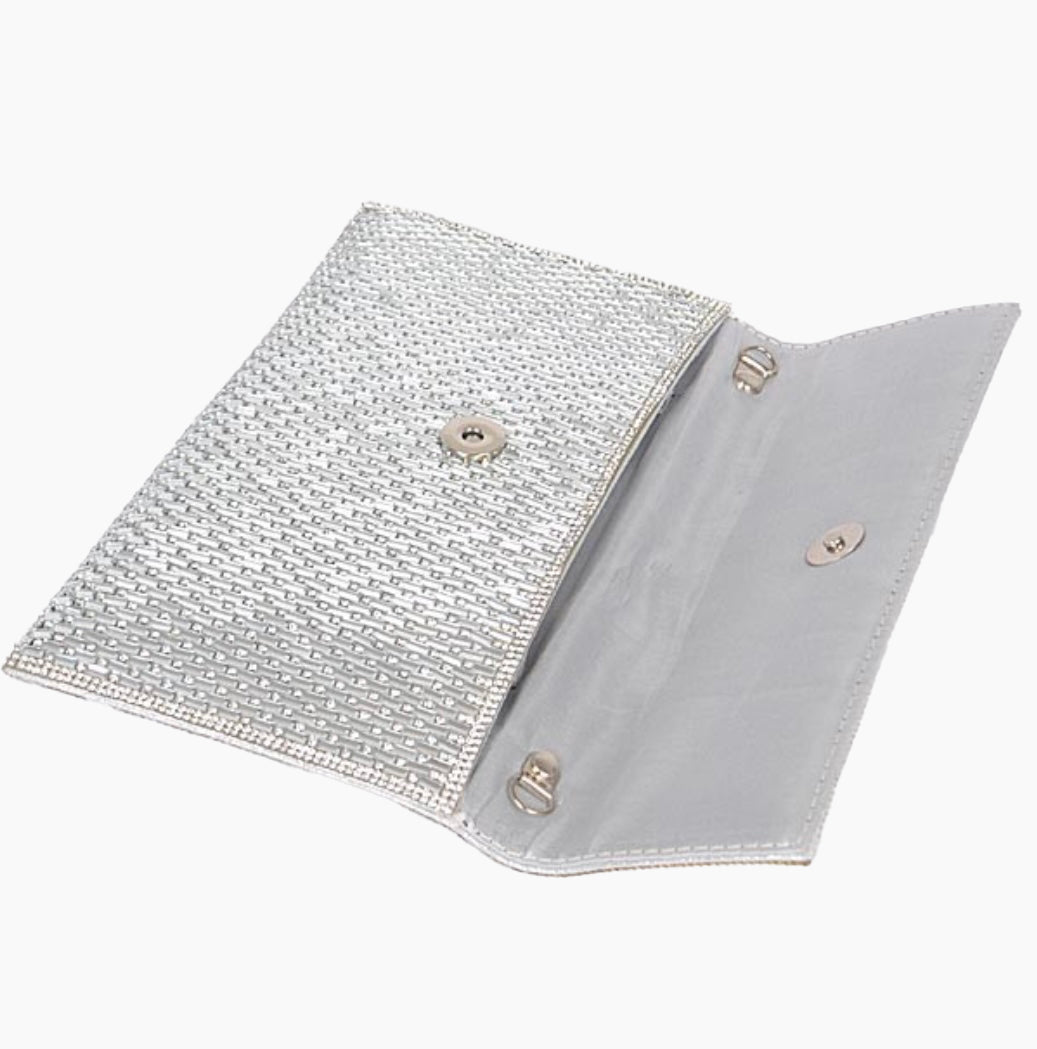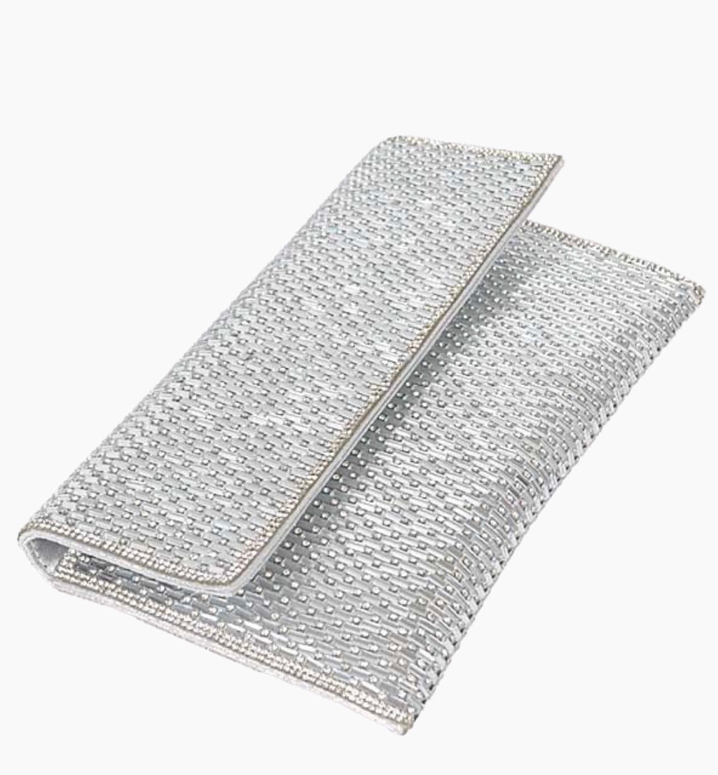 Designed to bring instant sparkle to any outfit. The unique clutch features a high-shine glass rhinestone exterior with a textured pattern that beautifully catches and reflects the light, giving it a luxurious, radiant finish. Its structured flap-over closure keeps the silhouette refined, modern, and perfectly polished for both evening and special-occasion styling.