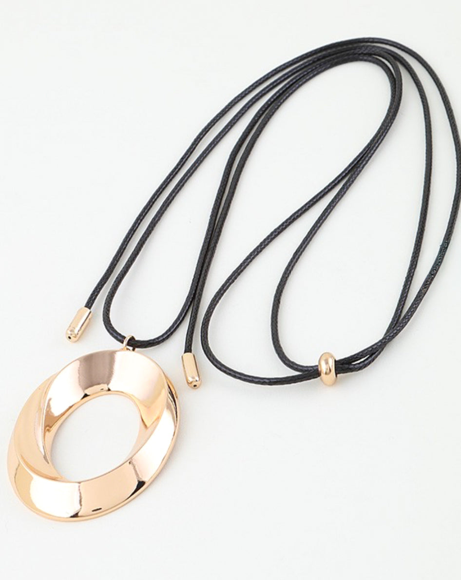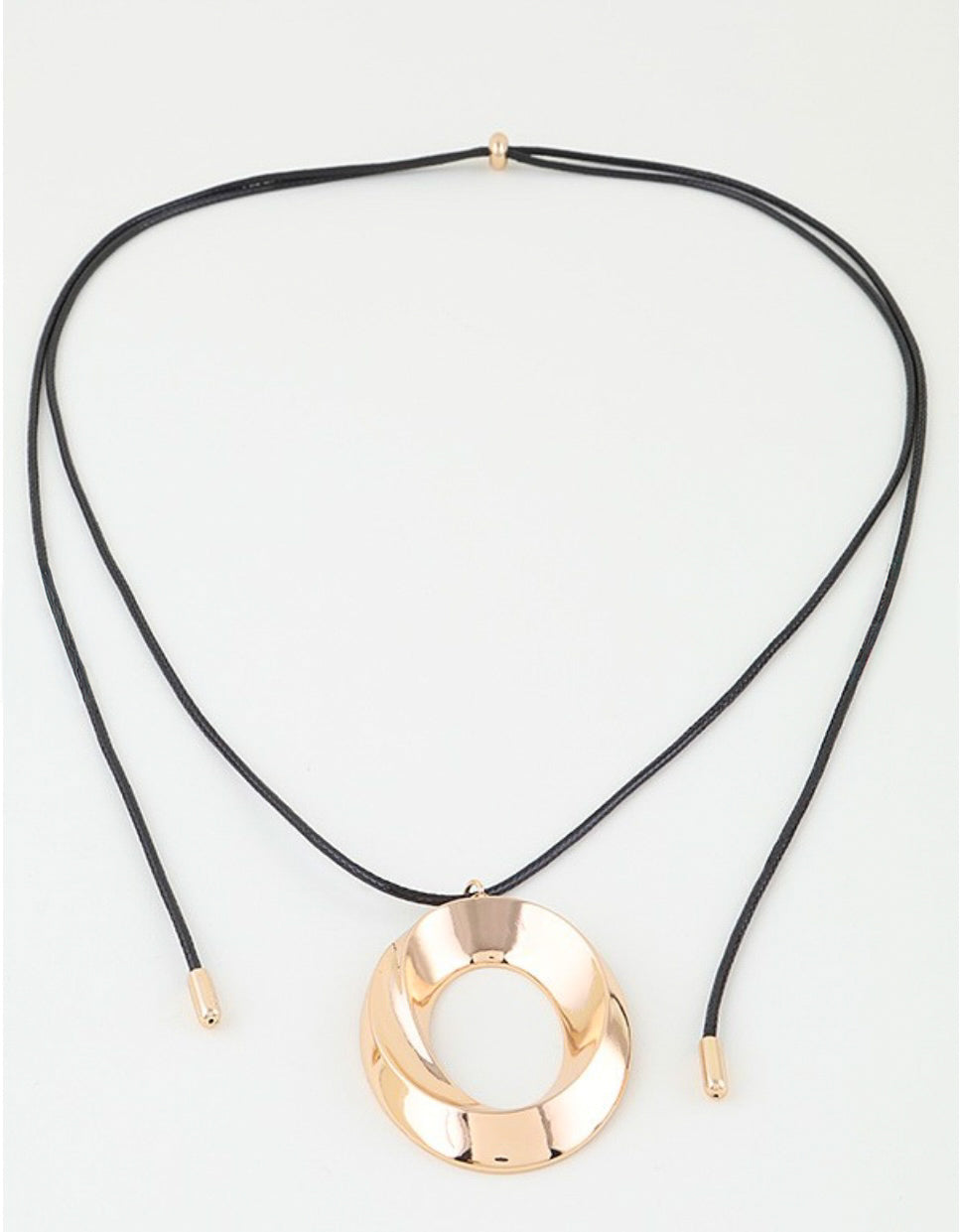 Add modern aesthetics to your collection with this interwoven open-loop wrap necklace, a bold yet versatile accessory that effortlessly elevates any outfit. The necklace features a striking circular pendant with an artistic open-loop design, crafted in polished gold-tone metal. Suspended from a sleek black adjustable cord, the pendant creates a modern contrast, making it easy to style with both casual and evening looks. The adjustable wrap style allows for customizable wear, whether you prefer a short choker fit or a long pendant drop.
