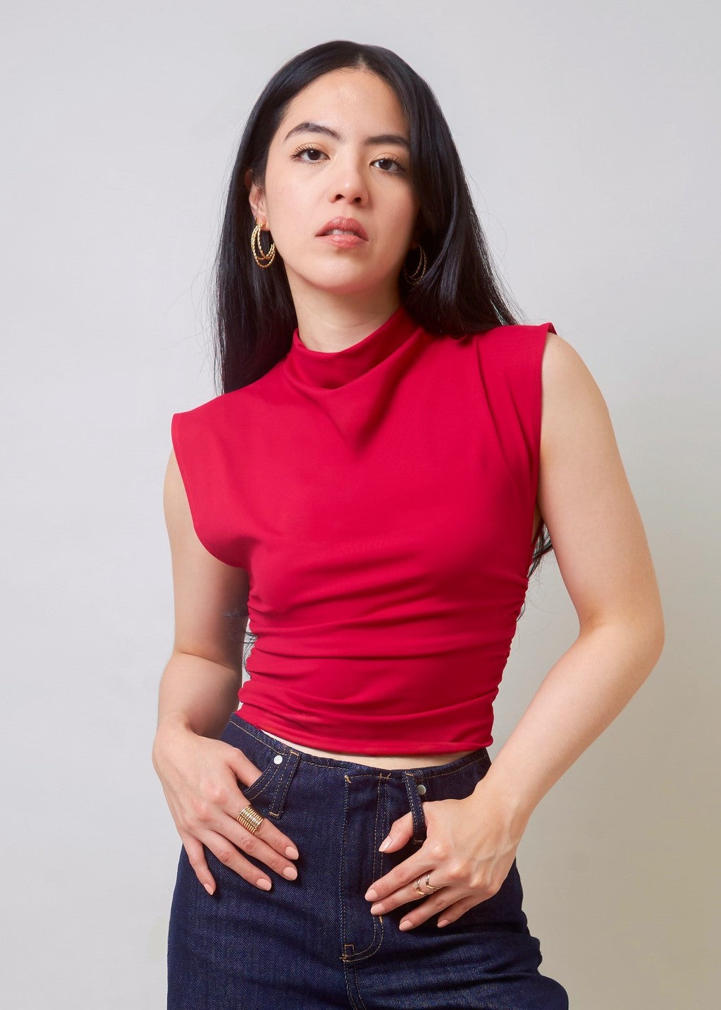 Stylish, versatile, and oh-so flattering. Our red sleeveless crop top is crafted in soft, stretchy fabric for a figure-flattering fit. It features a mock neckline with ruching details along the sides, adding texture and visual interest to enhance your silhouette and ensure you stand out.