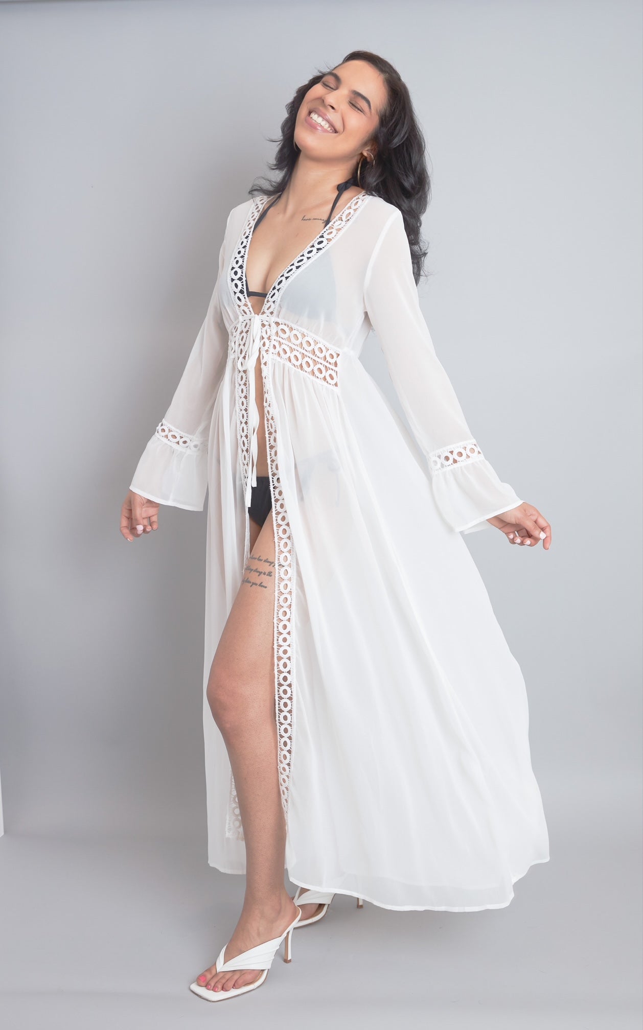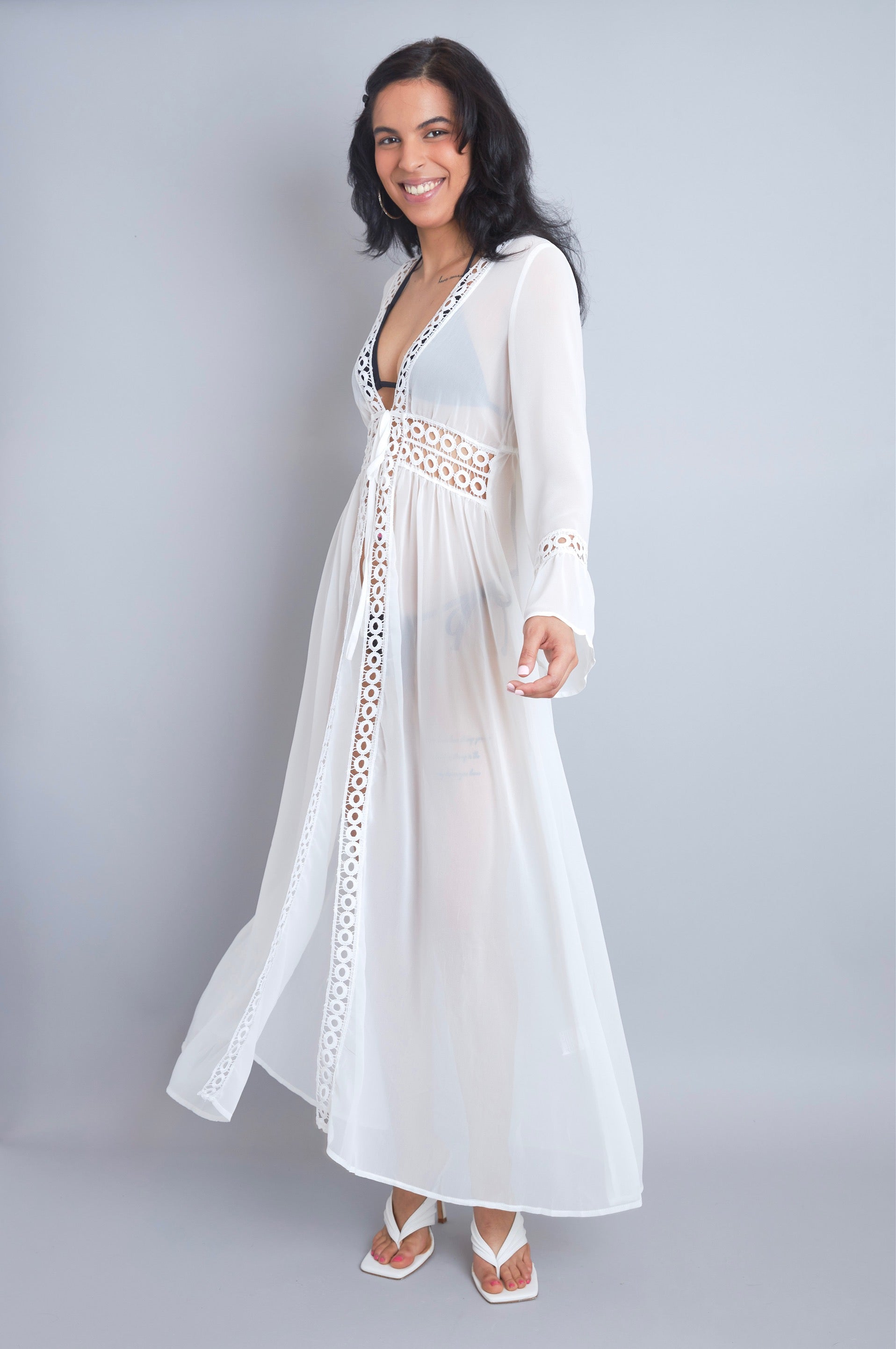 Let out your inner beach babe and check all the boxes with this have-to-have-it maxi beach (duster) dress cover-up! Whether you want to relax, lounge, or explore, this stylish piece ensures you look and feel your best. It's made of a sheer fabric and features long sleeves, with bell cuffs, elegant applique detail, and a tying sash.