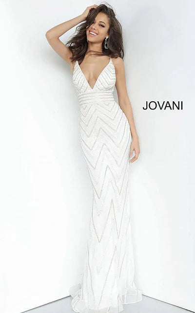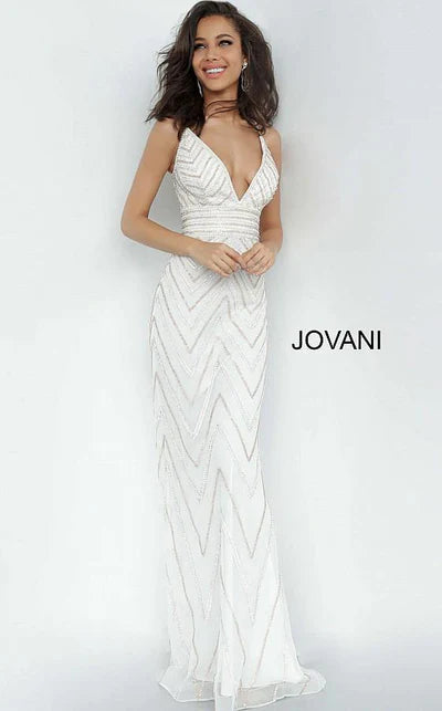 Show off your effortless style in this easygoing evening gown by Jovani. The sleeveless bodice boasts slender straps and a dramatic plunge at the center front. Sculpting lines trace a curvy fit, and a wide band girds the midriff. The fitted skirt streams past the hips and flares into a fashionable full-length and a whispery train.