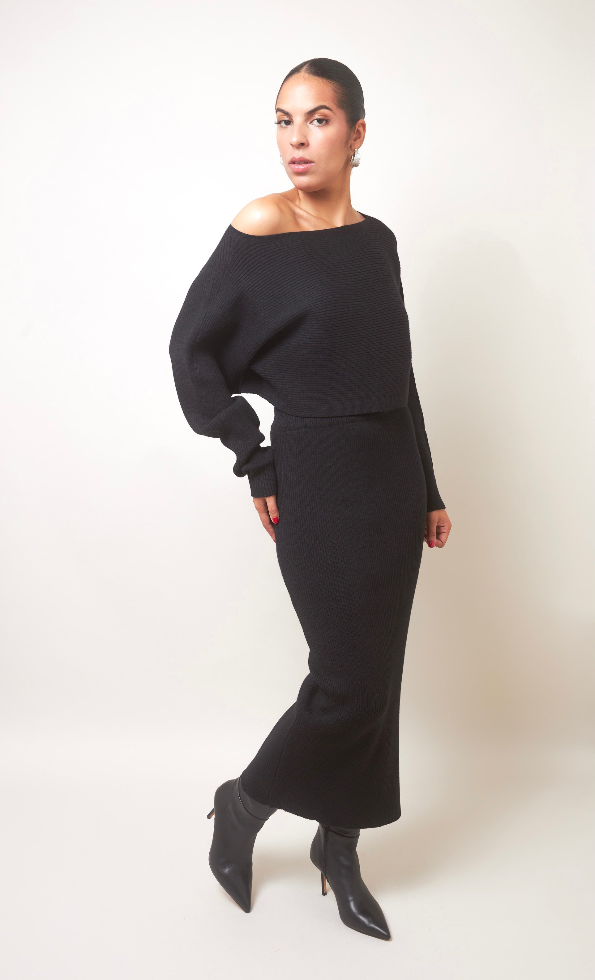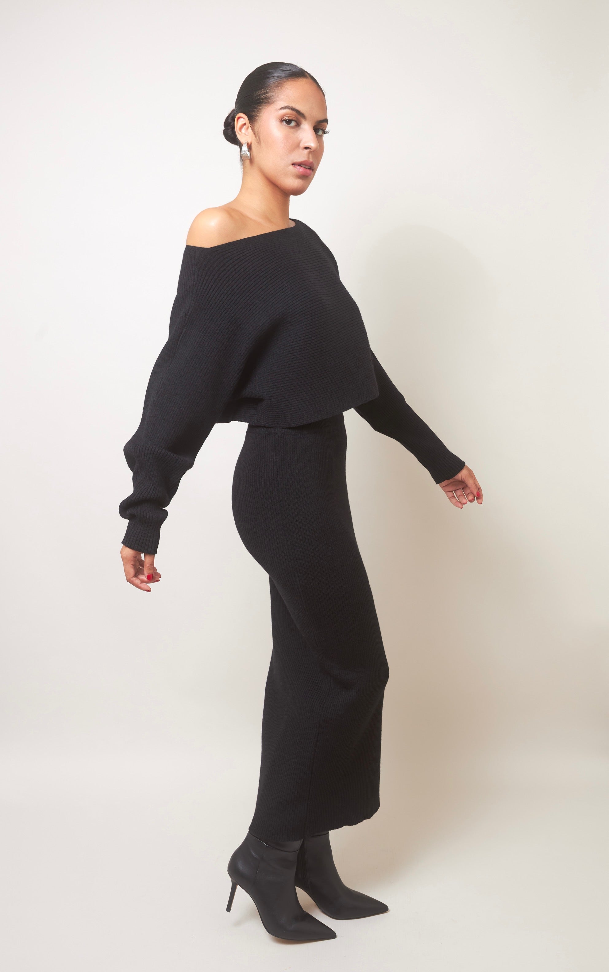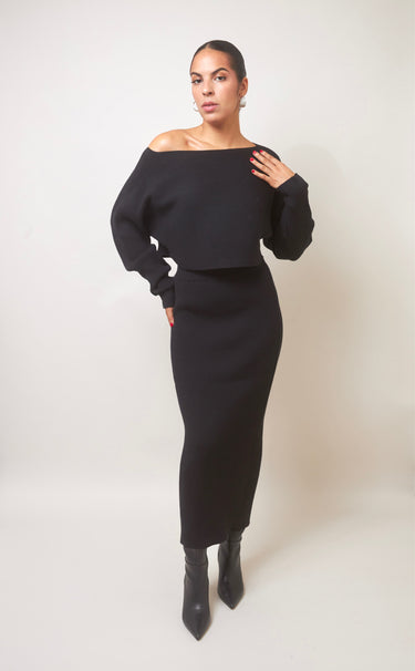 Minimal effort, maximum chicness. Effortless elegance meets cozy sophistication with this chic two-piece knitwear skirt set. Crafted from a soft, ribbed knit, the ensemble features a relaxed, slightly cropped sweater with long sleeves and an off-the-shoulder neckline, adding a subtly alluring touch. The matching high-waisted, fitted midi skirt elongates the silhouette, creating a sleek and feminine shape that moves with confidence.