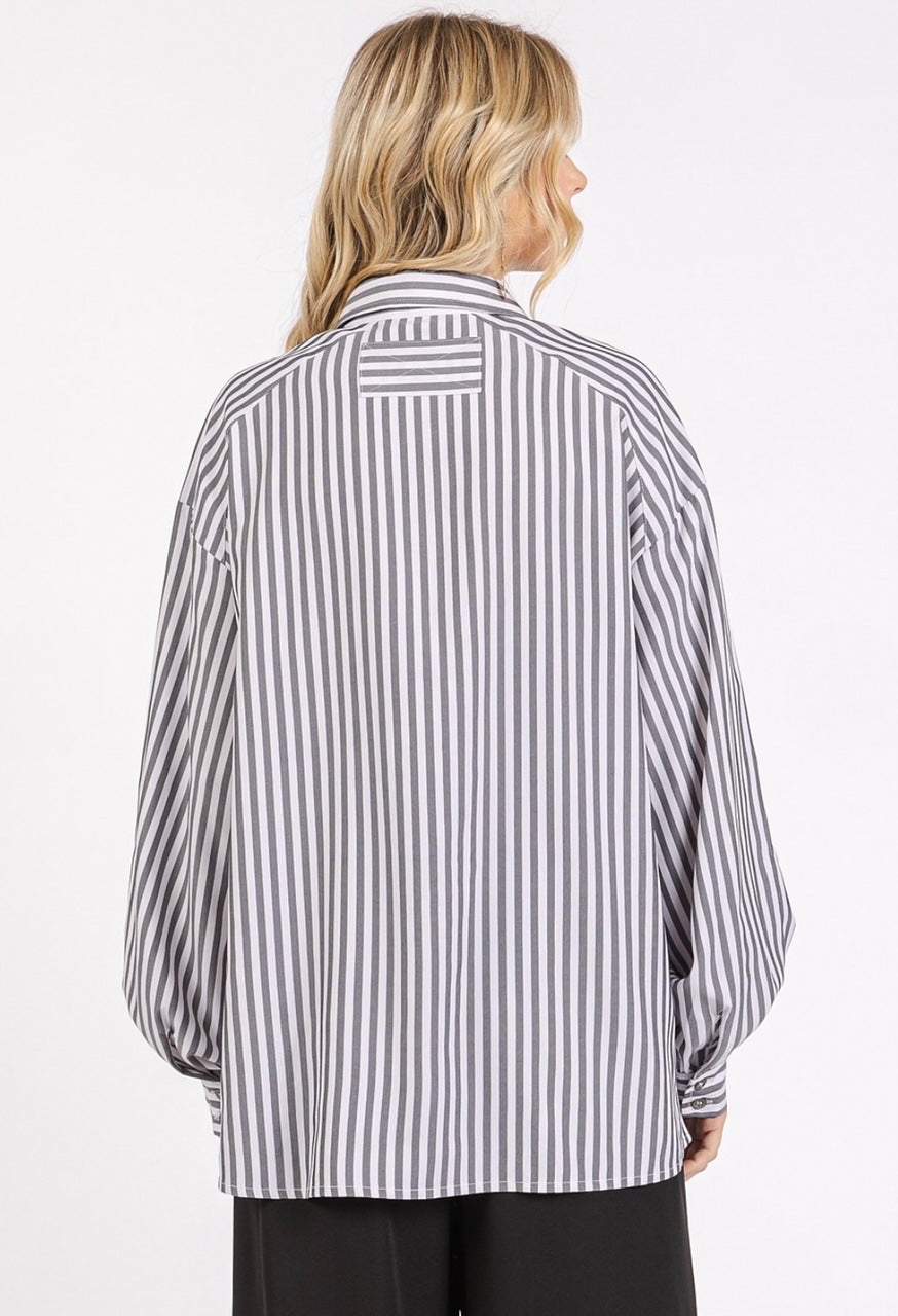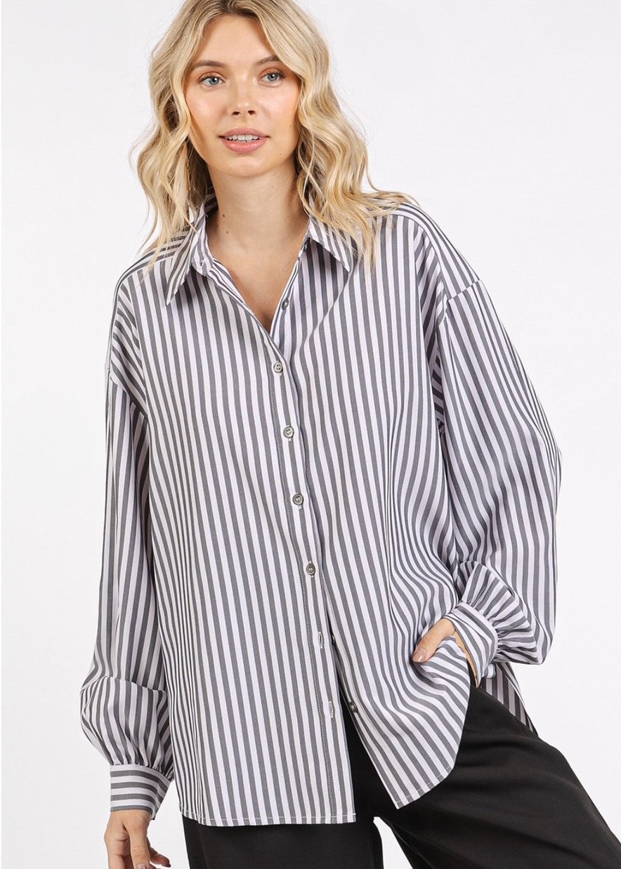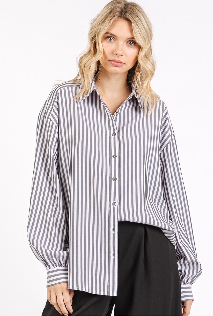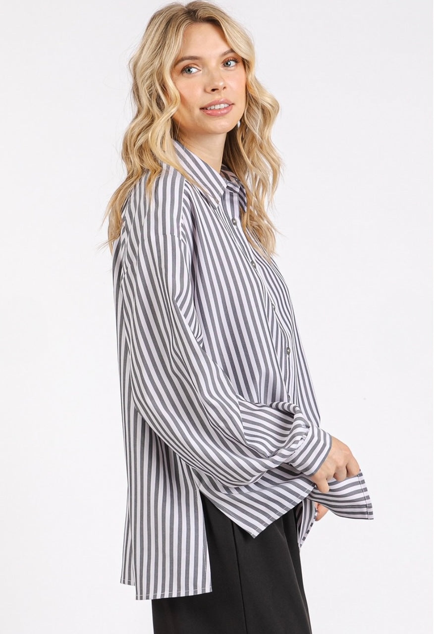 Polished Yet Relaxed. The perfect blend of comfort and style, this black and white striped button-up shirt features a relaxed fit that comfortably drapes on the body. The classic collar, the long sleeves with buttoned cuffs, and the side silts detail provide a polished touch. This versatile piece is an excellent choice for business casual settings or chic weekend ensembles.